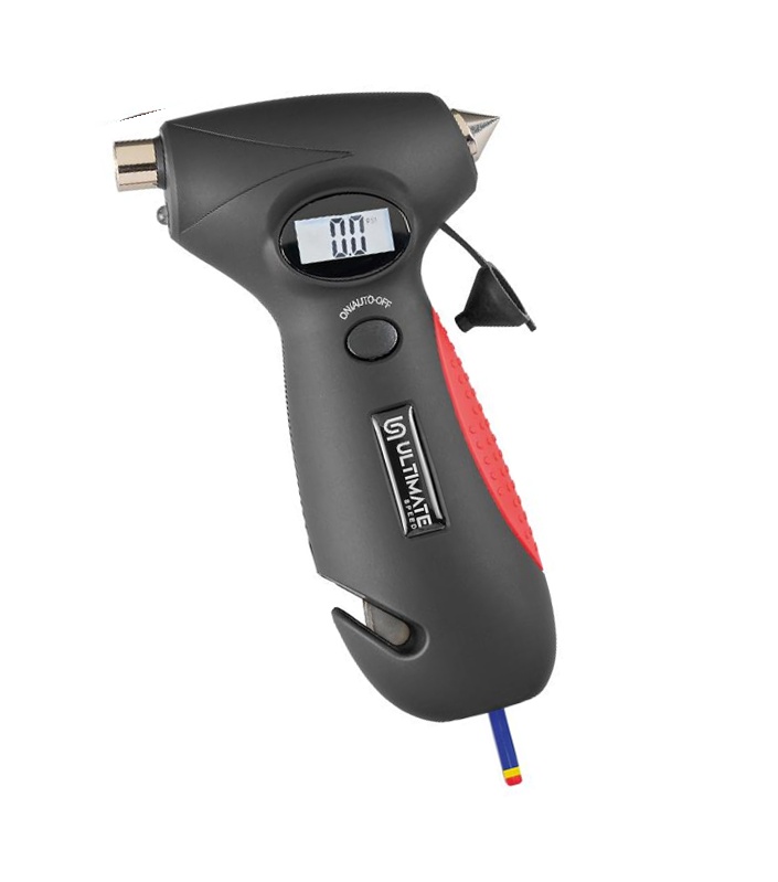 - 5 az 1-ben – digitális nyomásmérő, LED lámpa, vészkalapács, biztonsági öv vágó, menetfelőr-mélységmérő